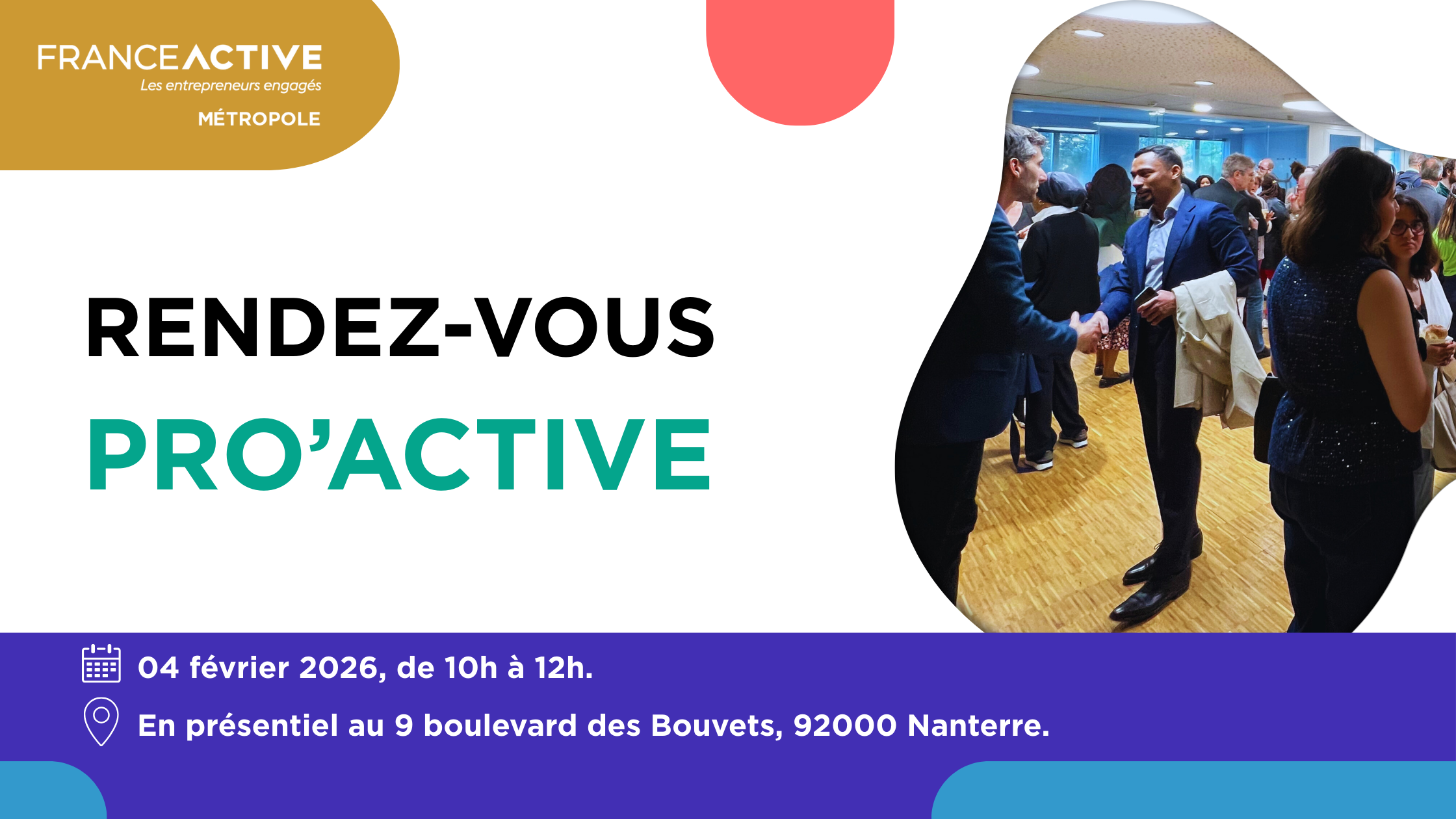 Suite à l’accord de financement de France Active Métropole, les entrepreneurs sont invités à participer aux RENDEZ-VOUS PRO’ACTIVE, organisés tous les mois. Ces rencontres sont spécialement dédiées aux porteurs de projets financés dans les territoires d’engagement de France Active Métropole : Hauts-de-Seine, la Seine-Saint-Denis et le Val-de-Marne.